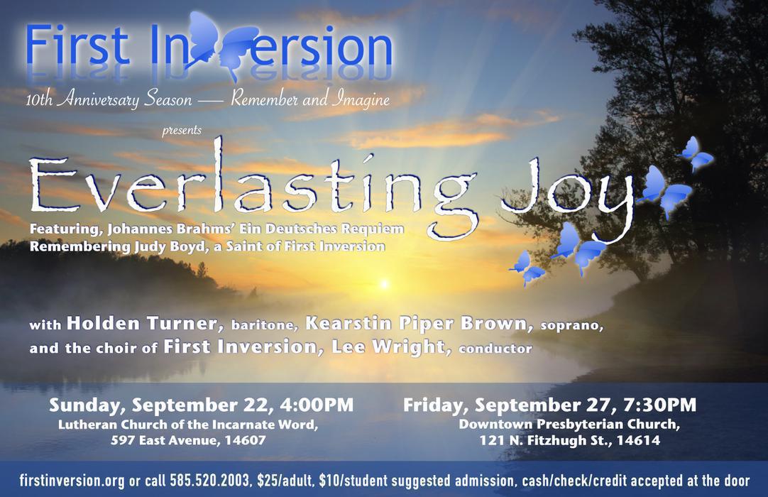 First Inversion kicks of it's 10th Anniversary Season: Remember and Imagine, with Johannes Brahms' beloved German Requiem. First Inversion will be joined by local soloists, Holden Turner, baritone, and Kearstin Piper Brown, soprano. We dedicate this concert to the memory of founding supporter, Judy Boyd.
